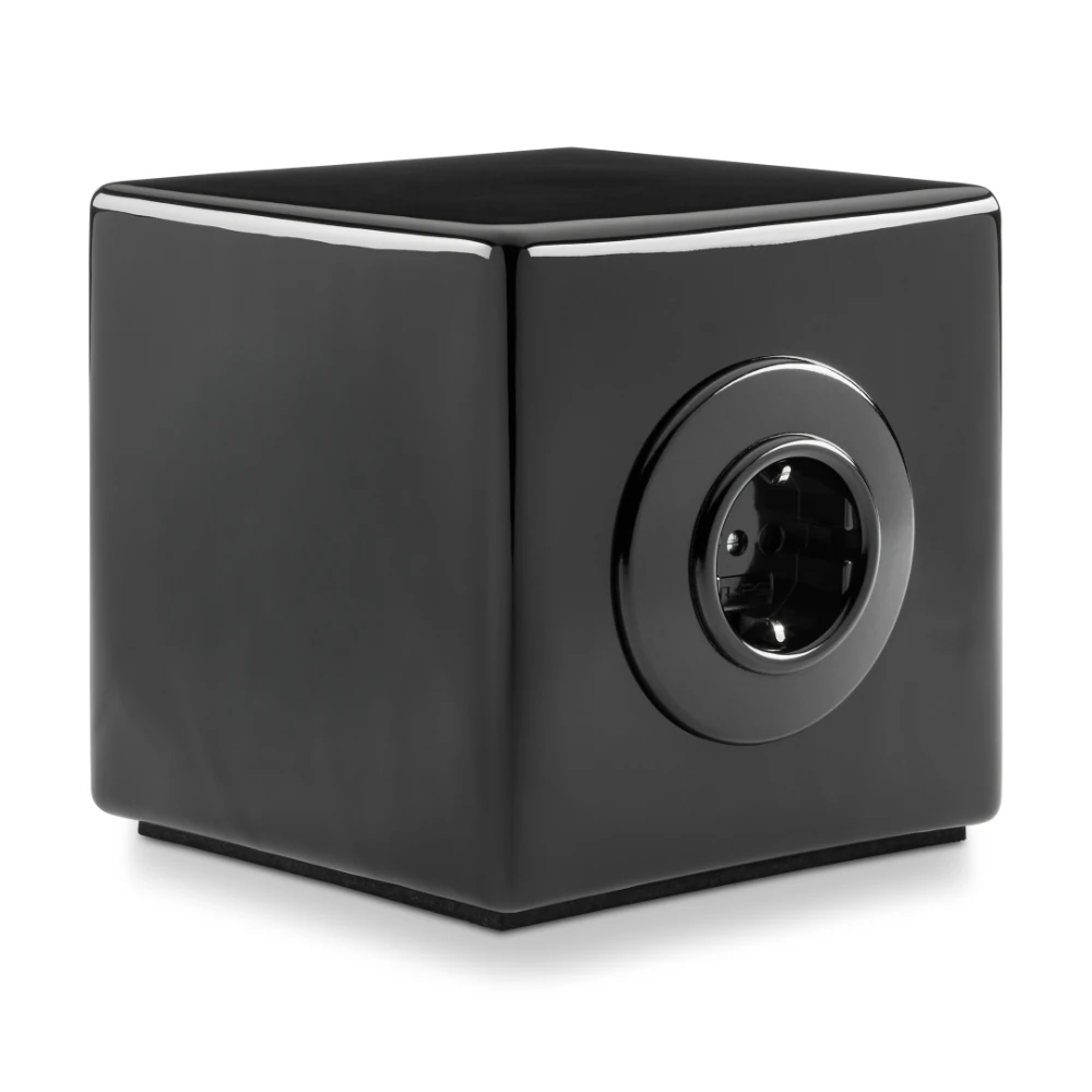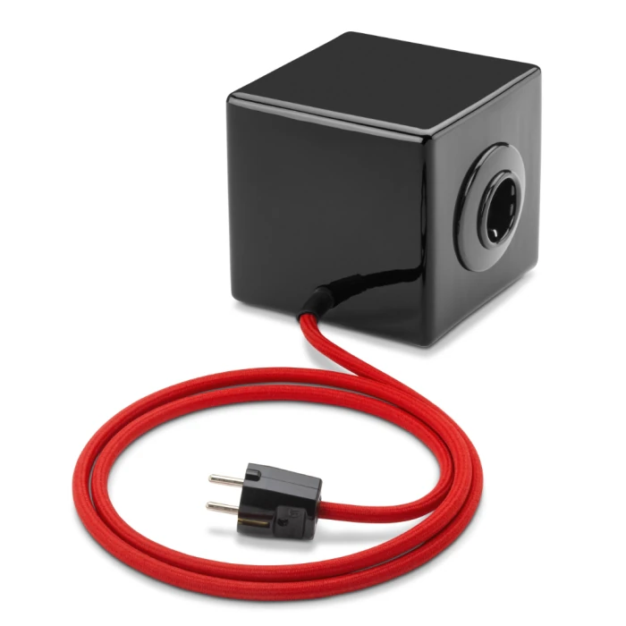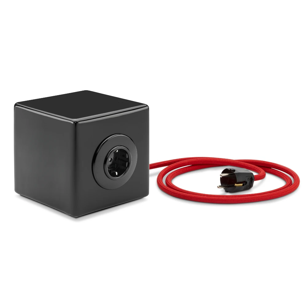 , mesurant 17 x 17 x 17 cm et pesant 2,8 kilos, équipé de quatre prises de courant en bakélite et d'un câble d'alimentation noir en câble textile Voka avec une fiche en bakélite. Cette lourde pièce s'installe dans tous les environnements possibles et imaginables de maison ou de bureau et les enrichit de sources de courant et de sa prestance.